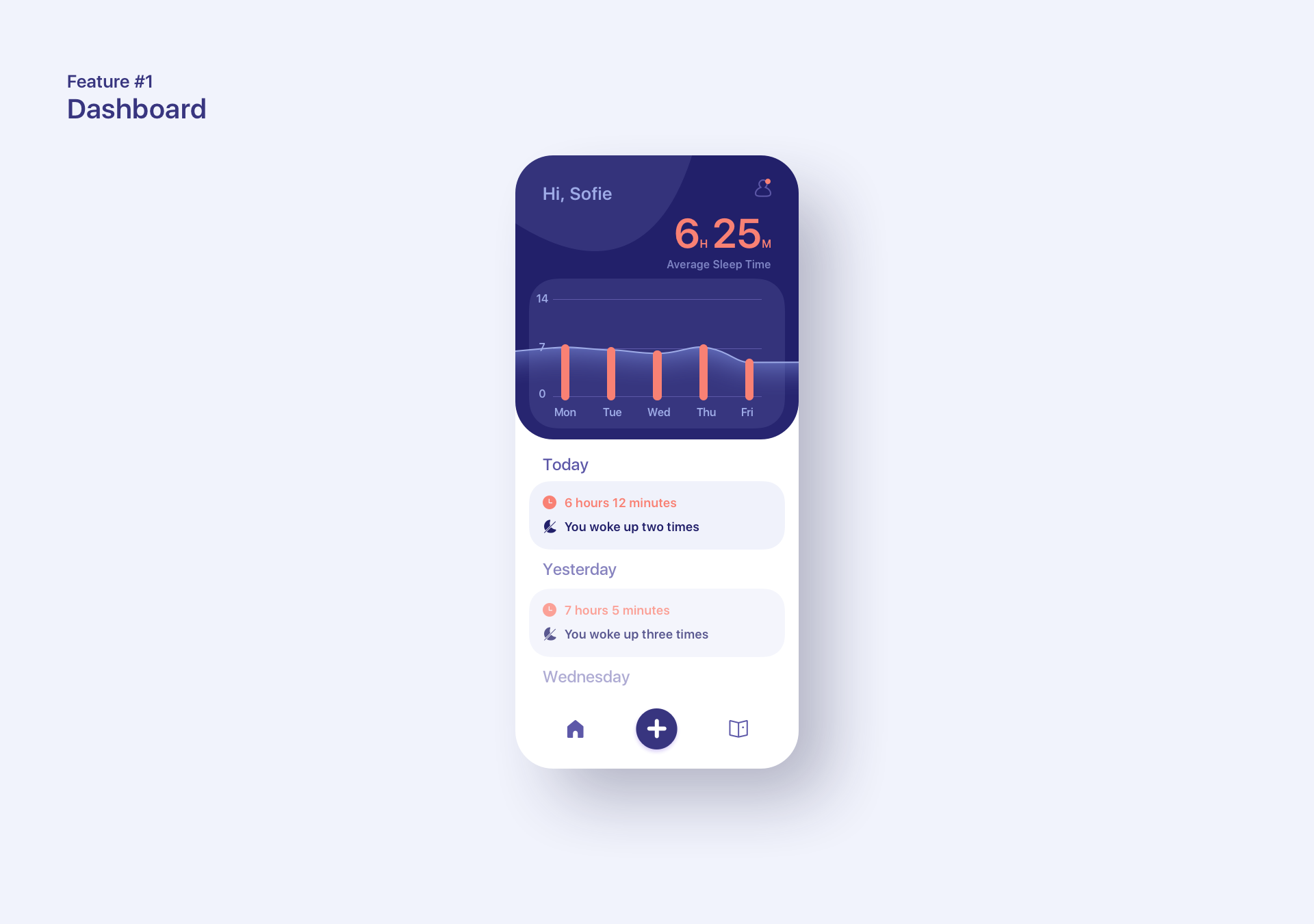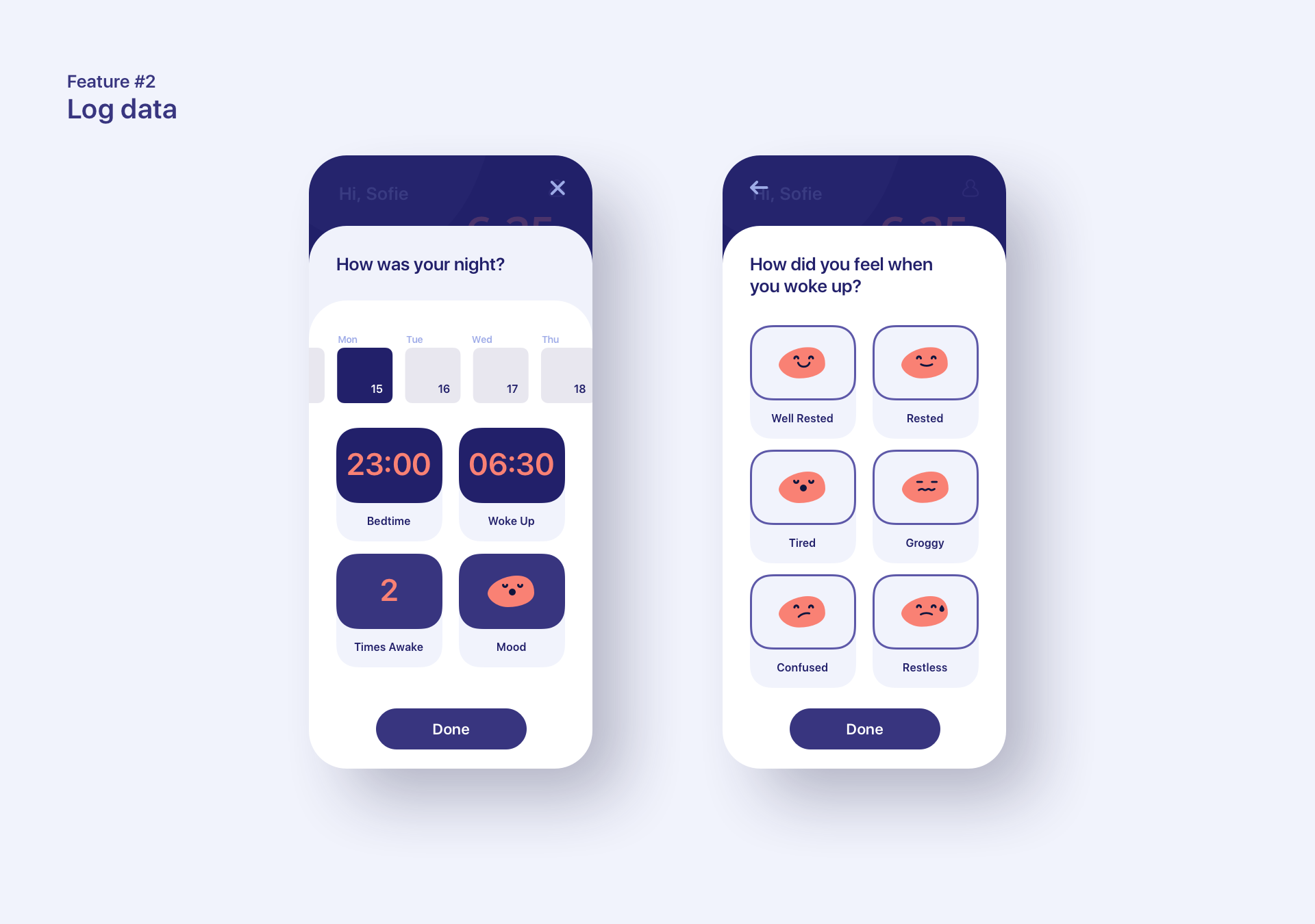 Track and improve your sleep with SleepMate. Calm color scheme and rounded shapes allowing users to easily logging data in the app. The SleepMate character is designed to assist and motivate patients to engage in their healthcare and medical treatment of Insomnia.